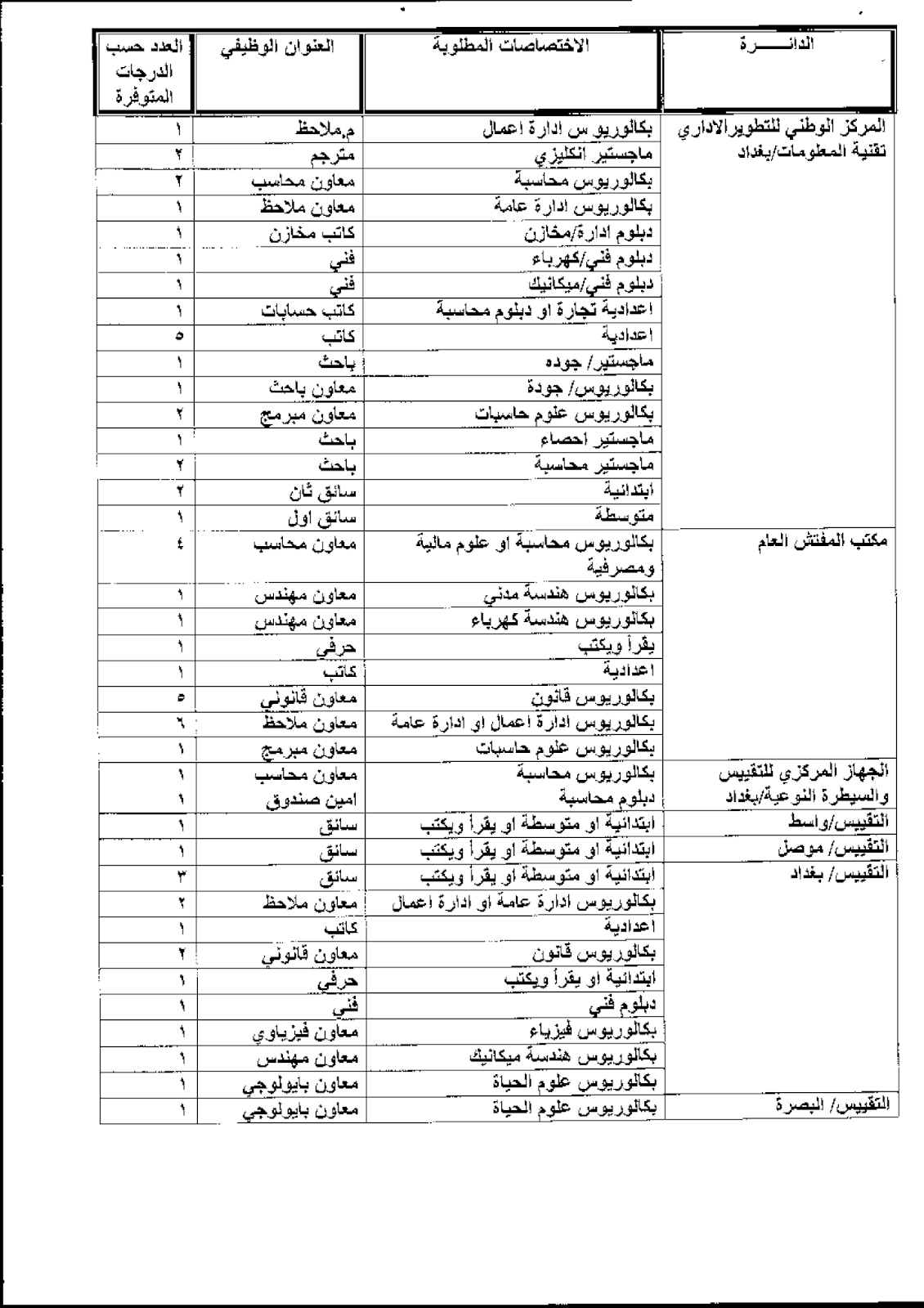 تعلن وزارة التخطيط عن فتح باب التعيين للدرجات الوظيفية الشاغرة وحسب التخصصات المطلوبة المدرجة مع التفاصيل في المرفقات أدناه :-